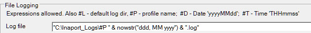 However, the log file name can actually be a full Inaport expression. In the screen shot above, the log file name is: