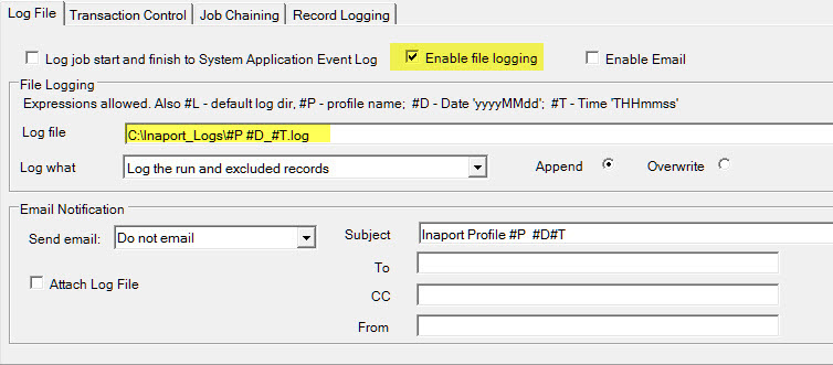 Setting up a log file for an Inaport job