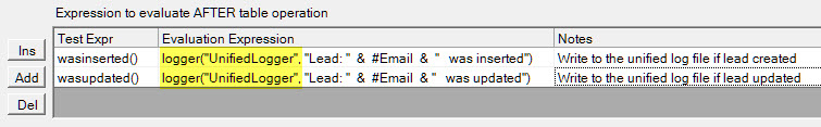 - The first row says “If the record was inserted, write “Lead: xxx@yyy.com was inserted” to the log file